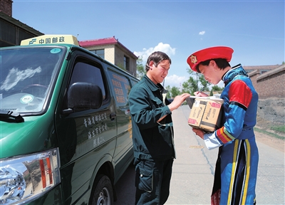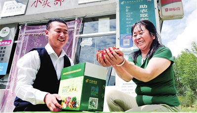 互助土族自治县邮政分公司投递员学习践行“鸿雁天路”精神,图为投递员为南门峡镇西坡村村民投递包裹。