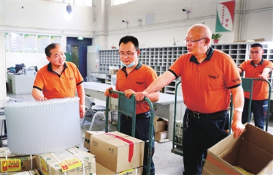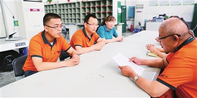 葛军(右)与伙伴们一起学习、研讨业务。