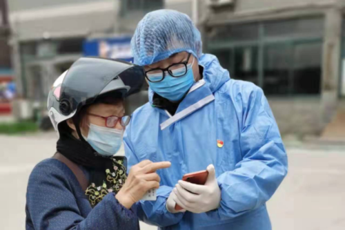 4月1日,集邮与传媒党支部的第一批志愿者刘卫东和颜小娟准时来到学田社区报到,恰好当天赶上崇川区全员第二轮核酸检测,在与社区工作人员简单沟通情况后,两人便迅速上岗,负责核酸采样现场的秩序维护、体温测量、采样码注册等工作。