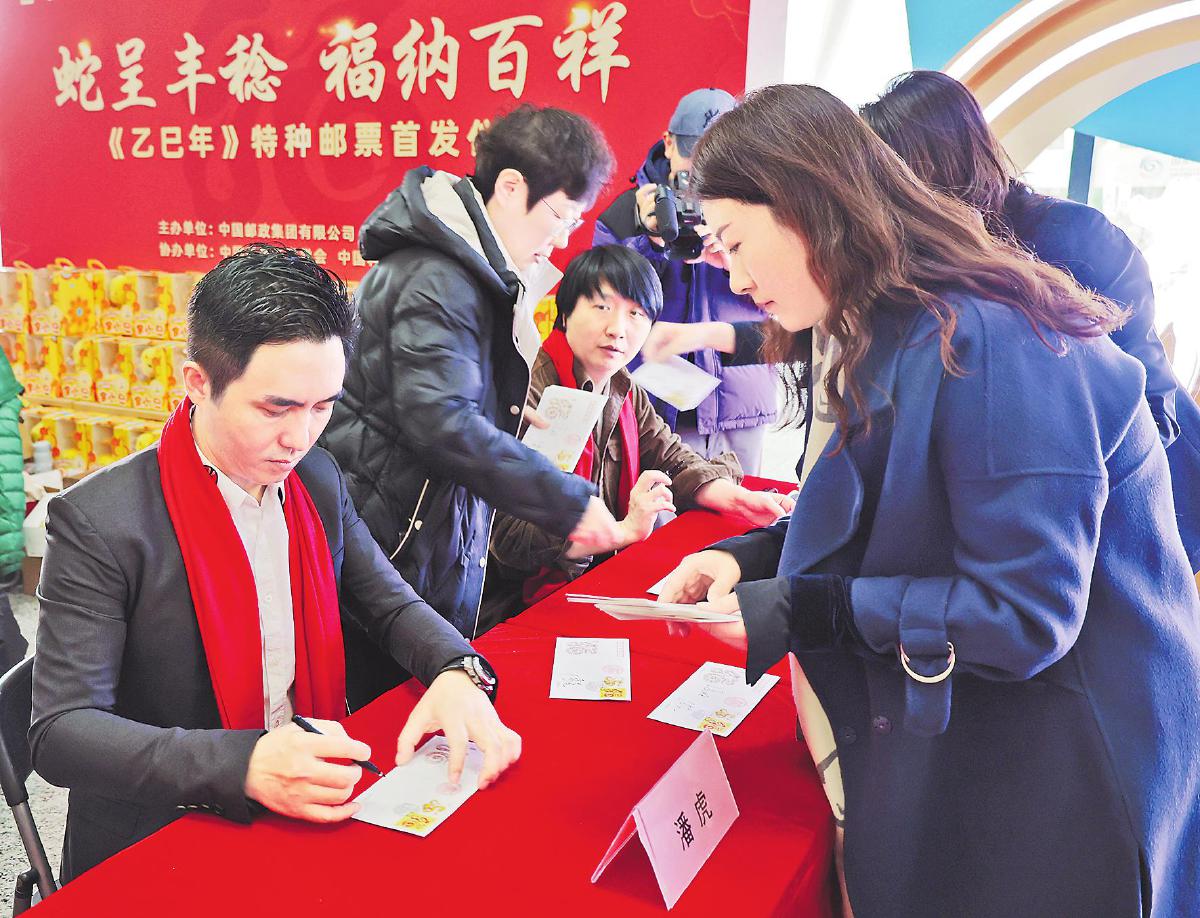 《乙巳年》特种邮票设计者潘虎、张旺在首发式现场签售。□李巍 摄