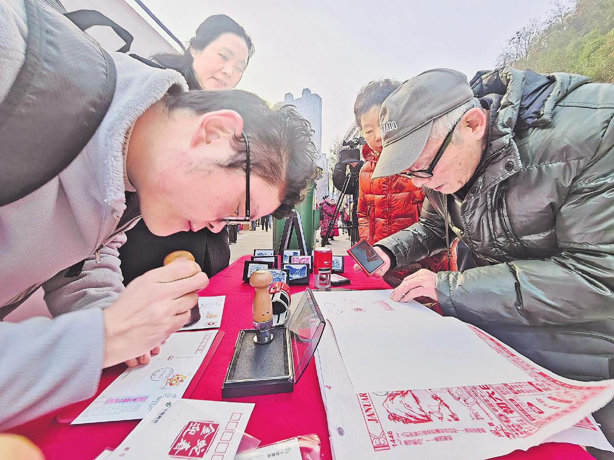 河南省南阳市邮政分公司多个网点联动开展生肖蛇票发行活动,启用《乙巳年》特种邮票发行纪念戳和蟒泉临时邮局纪念戳,免费为广大集邮爱好者加盖。在南阳市仲景路集邮专卖店,邮迷捧着加盖邮戳的纪念封欲寄给亲朋好友,传递新年祝福。□刘力扬 摄