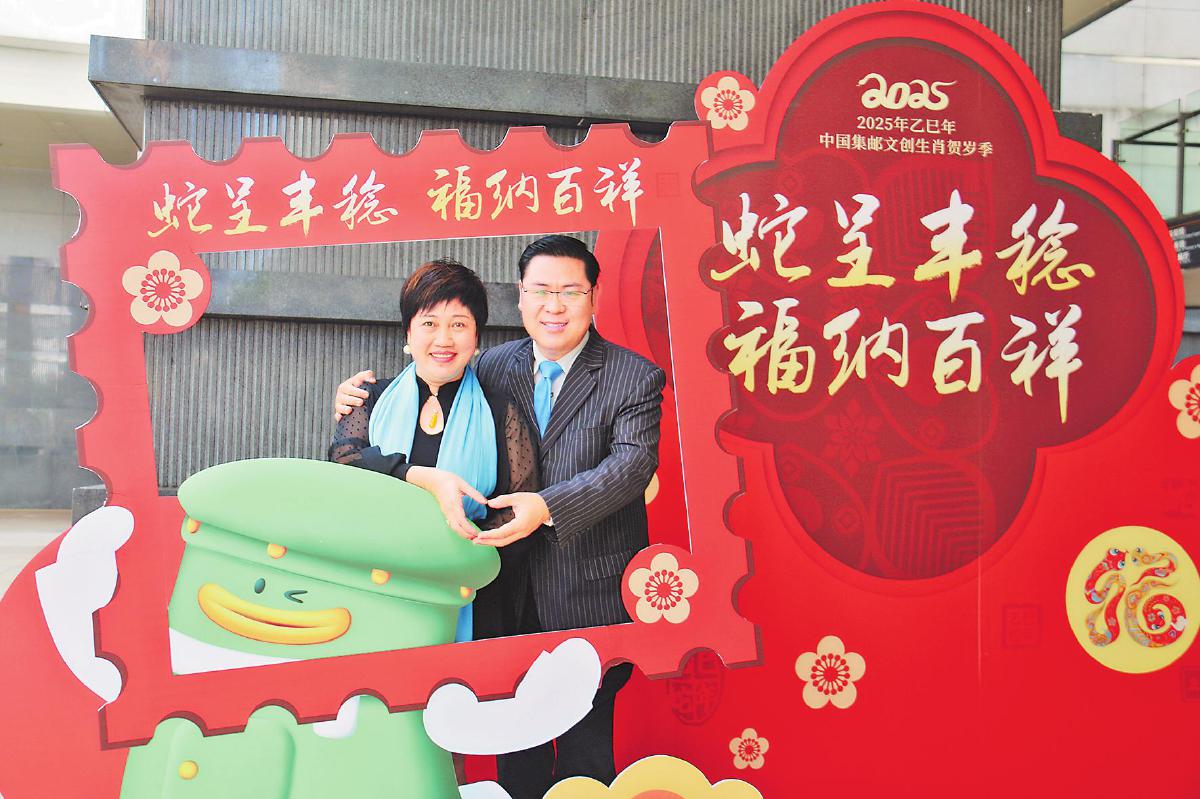 海南省邮政分公司联合海南省博物馆举办《乙巳年》特种邮票首发式。图为邮迷在活动现场打卡留念。 □黄文燕 李慧 摄