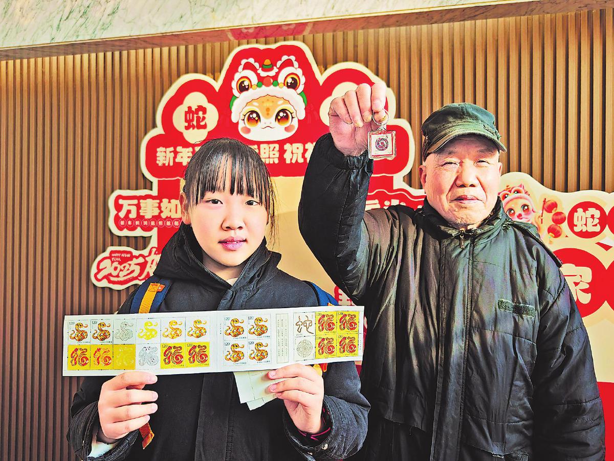 在江苏省徐州市金山东路的邮票门市部,75岁的资深邮迷沈师傅带着12岁的孙女最先买到了本命年生肖邮票,高兴地向邮友展示其自制的第一轮蛇年生肖邮票钥匙扣。 □谢安吉 摄