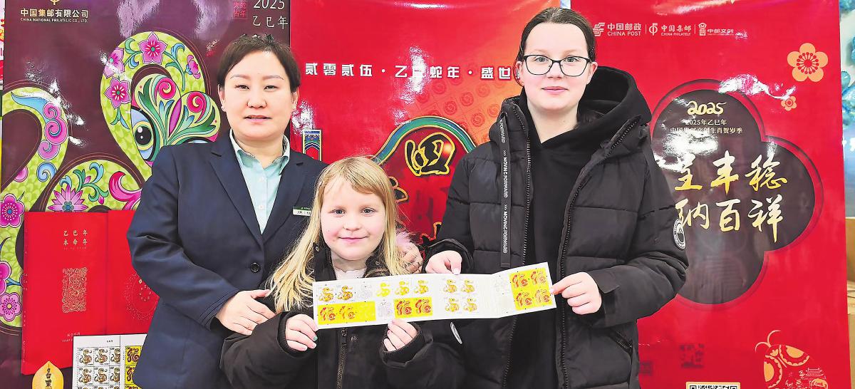 在黑龙江省鸡西市邮政分公司邮电大厦营业所的生肖蛇票首发现场,来自俄罗斯的一家四口购买蛇年邮票和明信片并邮寄给远在故乡的家人。营业人员与可爱的俄罗斯小朋友合影留念。□卢明琴 摄