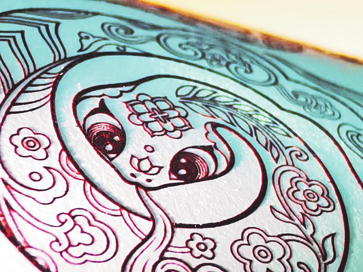 优秀的印制质量离不开优秀的原材料。在此次生肖邮票的印制中,北京邮票厂首次使用了新研发的触感雕刻油墨。雕刻油墨颜色更深更亮,触感更明显。用放大镜观察《乙巳年》特种邮票中的雕刻线条,可以看到绘画笔触似的刀锋,用手指在纸上轻轻抚摸时,图像轮廓有明显的凸起感。