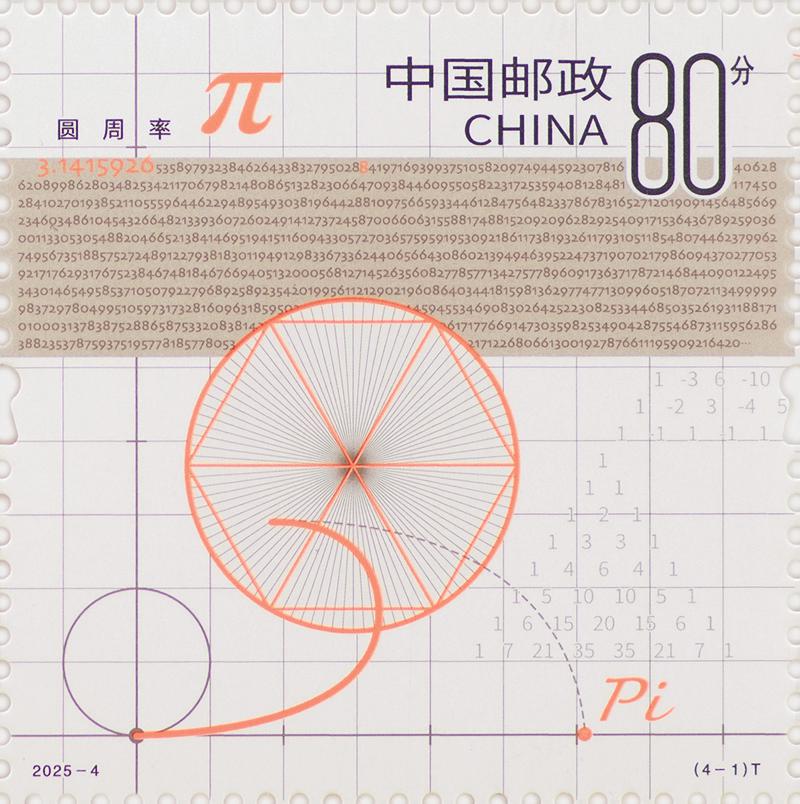 该套邮票设计语言现代,使人眼前一亮。第一枚“圆周率”作为广为人知的数学常数,贯穿于几何、物理等众多学科。邮票元素包含了π的本质定义,以极细线表现早期经典割圆法,并将圆周率小数点后996位以缩微文字的方式呈现于画面,特别通过橘色设计突出前7位,为的是纪念我国南北朝时期数学家祖冲之。第二枚“勾股定理”是中国古代几何学的成就之一。它给出了直角三角形三边的长度关系,即任意一个直角三角形的两条直角边长度平方之和等于斜边长度的平方。邮票在局部采用烫印工艺,以分层的视觉形式展现了证明过程。第三枚“欧拉公式”被誉为“数学中最美的公式之一”,邮票以图形的方式表现了欧拉公式将数学中5个重要常数(e、i、π、1、0)联系起来。欧拉之眼图案部分采用缩微工艺,将这5个常数与防伪技术相结合。第四枚“莫比乌斯带”作为一种神奇的拓扑图形,只有一个面和一条边界。邮票采用局部烫印工艺,丰富的色彩变幻更好地呈现莫比乌斯带的多维性质。在紫外光照射下,蚂蚁的足迹和画面下方的银河相呼应,寓意着从微观逐步扩展到更广阔的宏观领域。