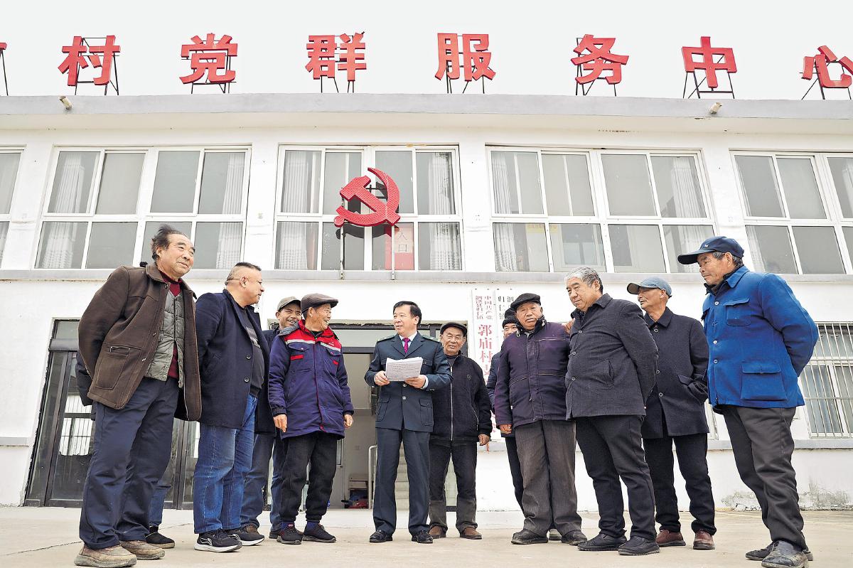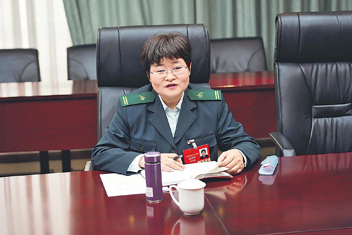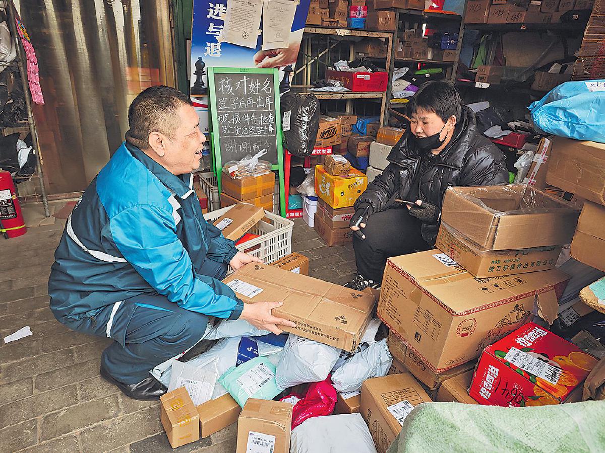 全国人大代表、河北省邢台市邮政分公司城区寄递事业部乡邮员郭红岗向投递道段上的客户讲述全国两会的盛况,传递党的声音。 □程钰 孙延兵 摄