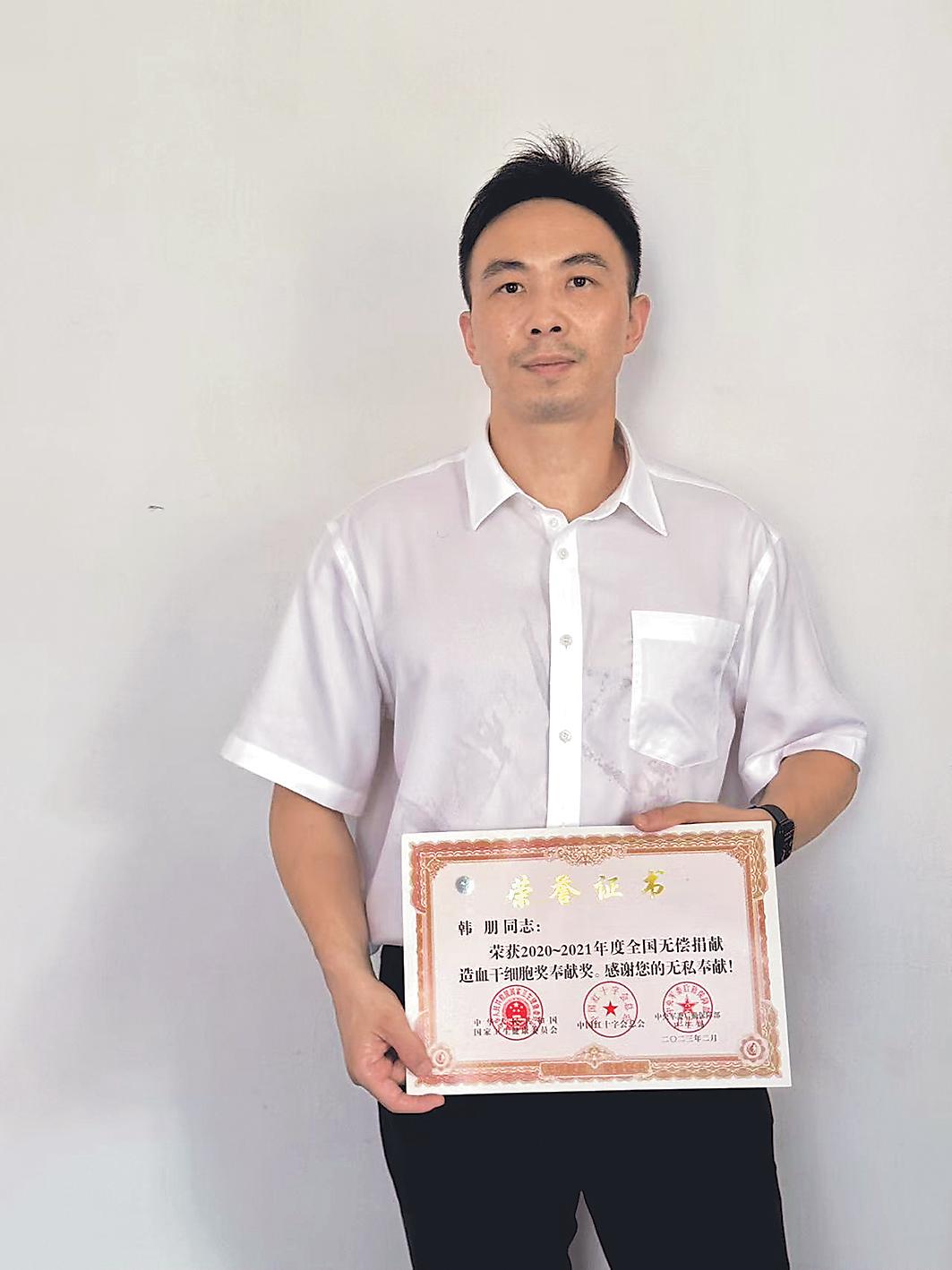 1981年出生的韩朋是同事眼中的“公益先锋”,多年来坚持参与各类志愿服务。2011年,他在一次公益宣传活动中了解到,造血干细胞移植对白血病、再生障碍性贫血等重症患者有重要意义。怀着对生命的敬畏和助人的热忱,他毫不犹豫地报名成为中华骨髓库的一员。