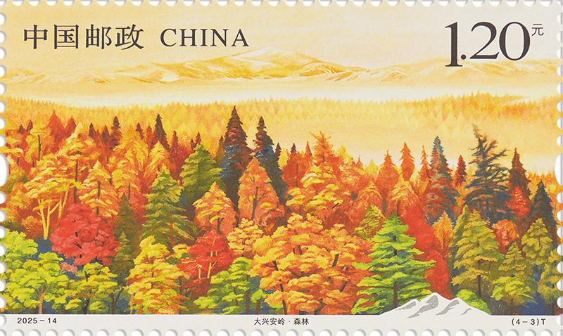 第一枚“湿地”表现了候鸟回归、杜鹃花开时的湿地风光,展现了大兴安岭良好的生态环境。第二枚“火山”表现了火山形成的天池风光,展现了大兴安岭独特的地理环境。第三枚“森林”(见上图)表现了大兴安岭秋天的森林风光,展现了浩瀚原始森林绚丽多彩的景色。第四枚“极光”表现了冬季天空出现绚丽极光的美丽景象,凸显了高纬度地区的独特天象。