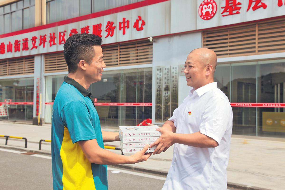 重庆市邮政分公司通过网点重点展示和视频联播宣传,确保重大主题图书发行工作高效推进。图为江津邮政投递员为鼎山街道艾坪社区及时配送《习近平谈治国理政》第五卷。□王春兰 崔卡 摄影报道