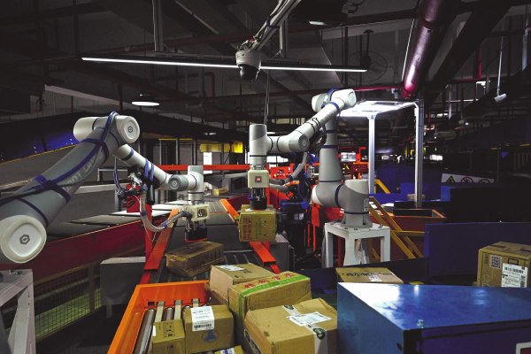 8月19日,在安徽省合肥邮区中心,双臂供件机器人在抓取分拣快递邮件。